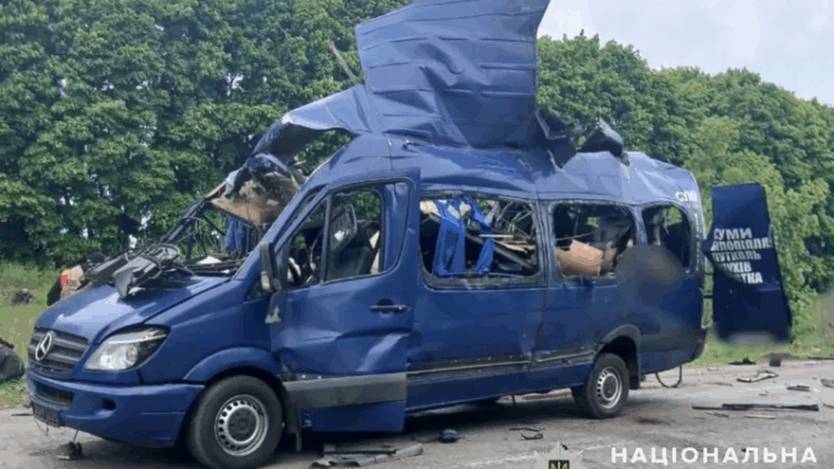 Regional military leaders said seven other people were injured in the attack on Saturday morning in Bilopillia, Sumy, as the minibus travelled to the regional capital close to Russia’s border.