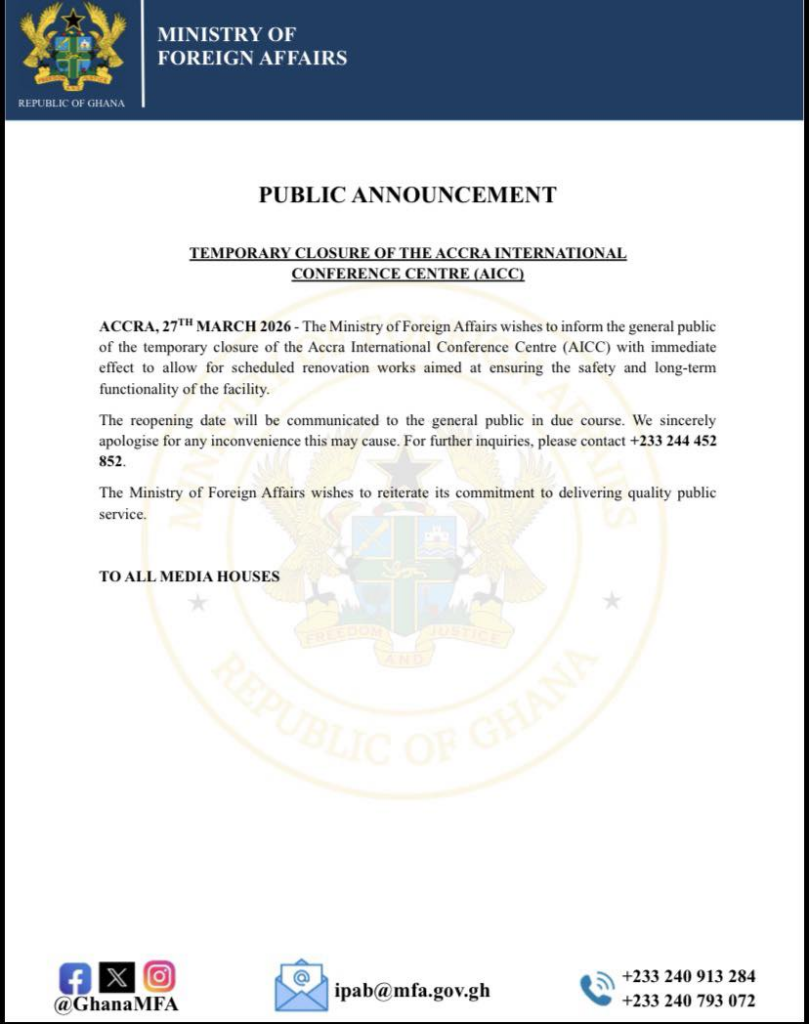 The Ministry of Foreign Affairs has announced the immediate temporary closure of the Accra International Conference Centre (AICC) to carry out essential renovation works aimed at enhancing safety and long-term functionality.