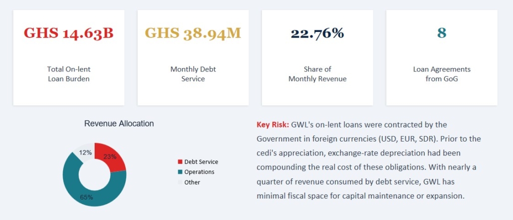 GWL is also facing a major financial crisis, with a total on-lent loan burden of GH¢14.63 billion, equivalent to nearly a quarter of its revenue.